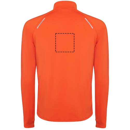 Technische raglan sweater met lange mouwen voor heren. Kraag met een halve rits en een omgekeerd ontwerp met reflecterende details. Verstevigde naden. Manchetten met duimopeningen. Reflecterende details op de achterkant. De zoom aan de achterkant is iets langer dan aan de voorkant. Warme geborstelde binnenstof.
