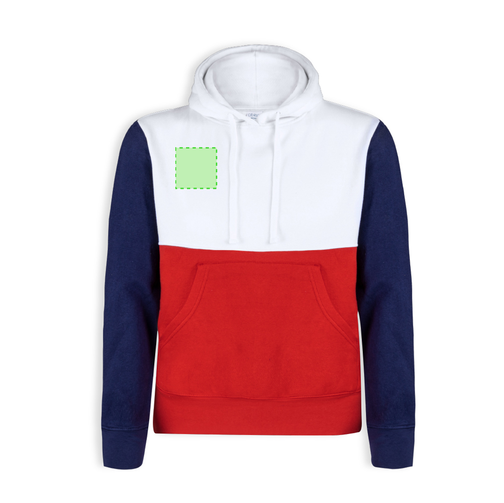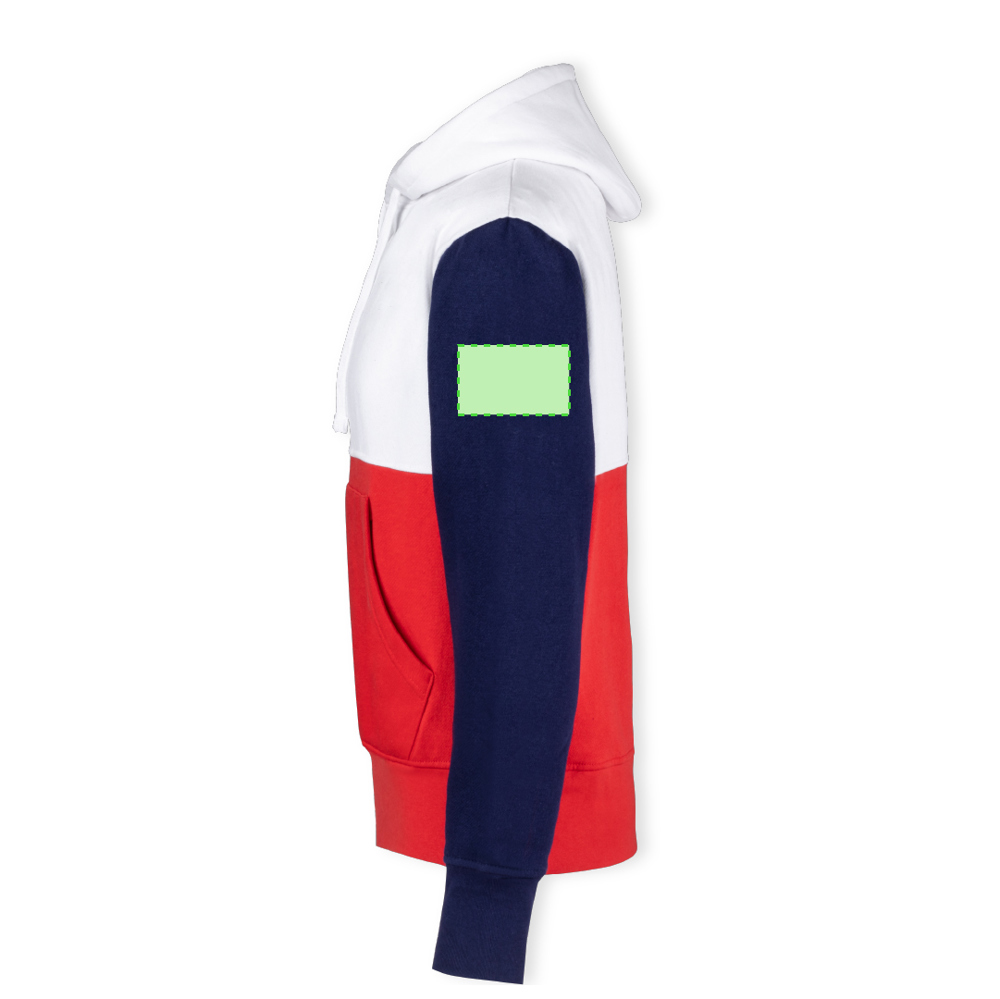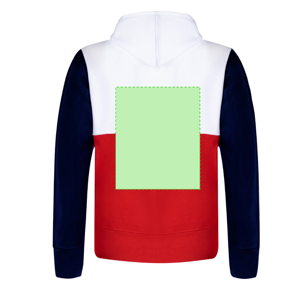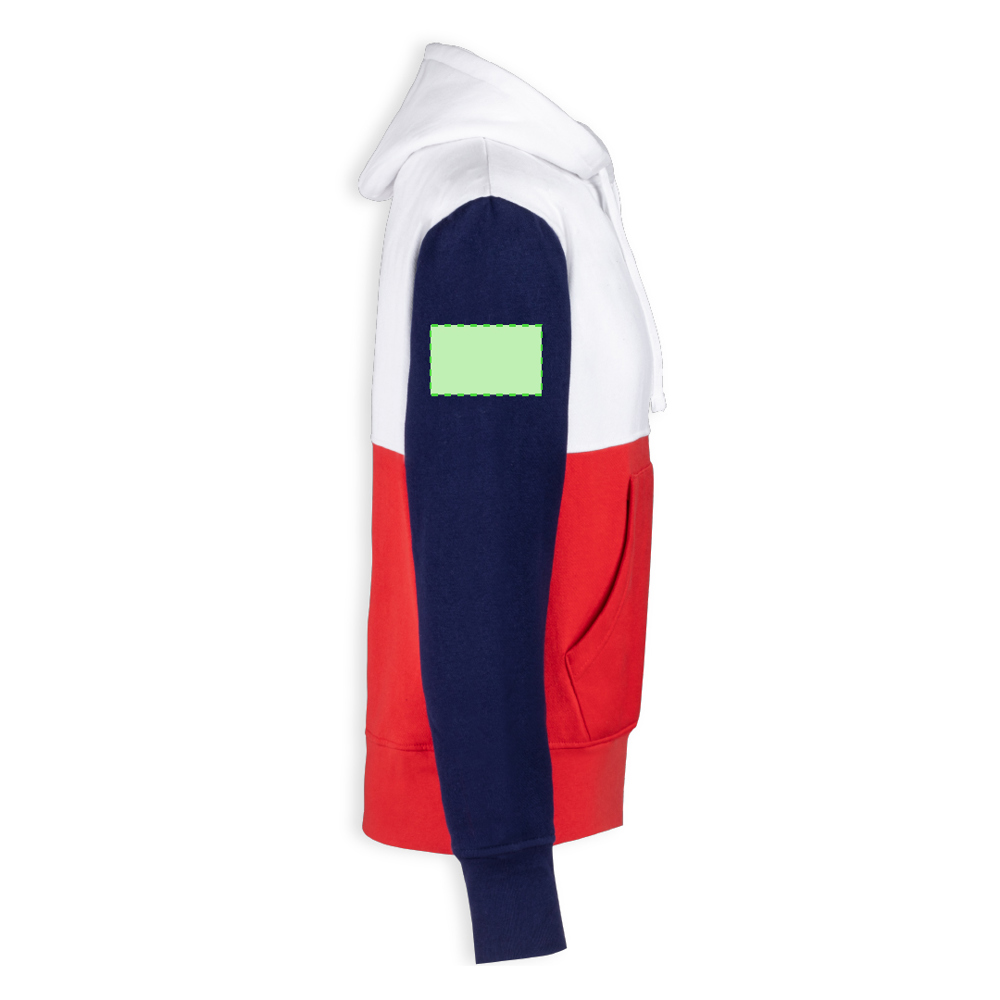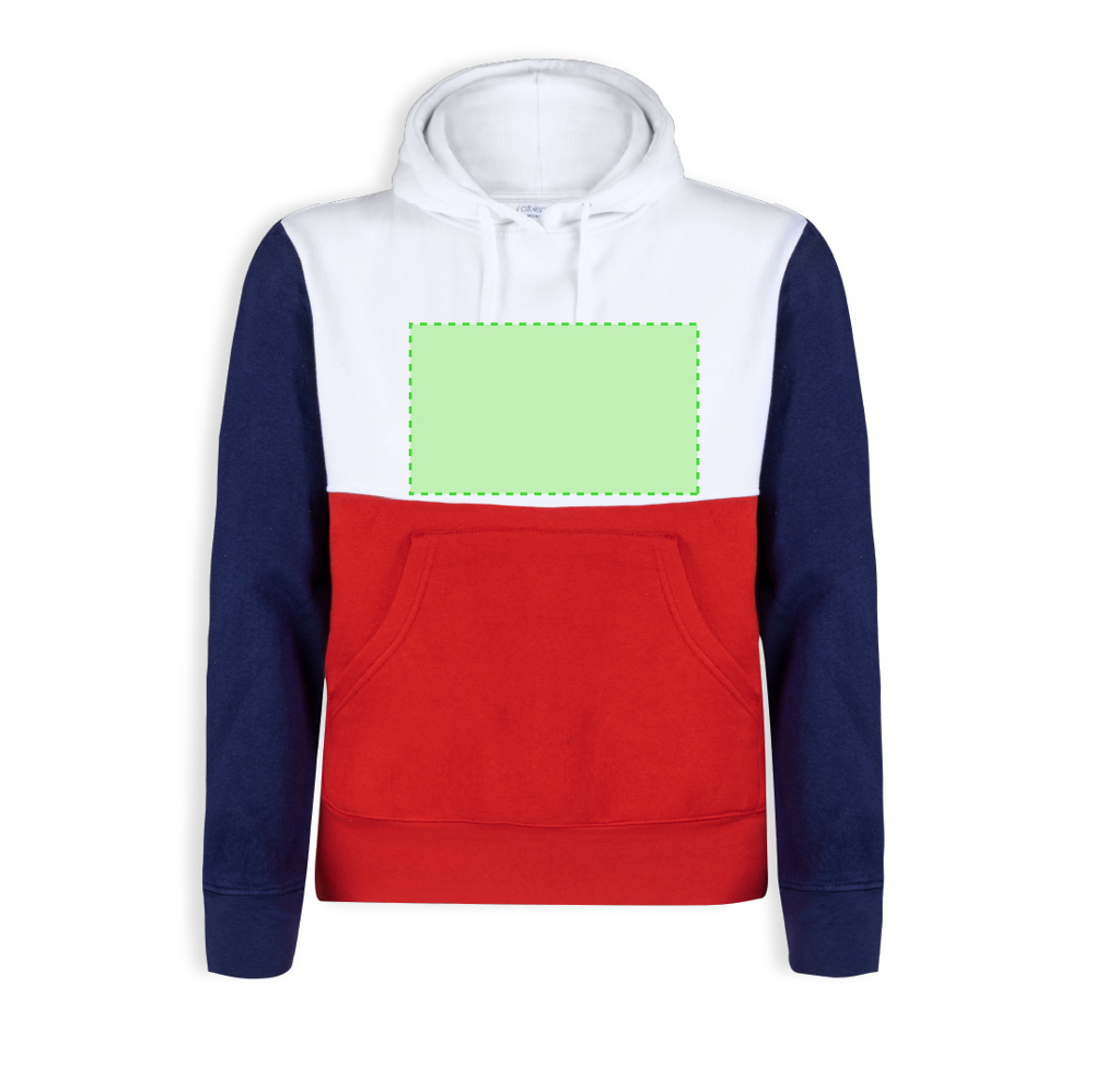 Driekleurig unisex sweatshirt met capuchon, met kangoeroezak en extra brede elastische banden voor een perfecte pasvorm. Gemaakt in combinatie van katoen en polyester 280g/m2. Binnenkant van geborstelde badstof voor een eersteklas gevoel. Zacht aanvoelend en moderne snit, met verstelbare platte koorden en geborduurde oogjes, waarbij het gebruik van metaal wordt vermeden. Dubbele stiksels voor duurzaamheid en weerstand tegen intensieve slijtage. Eenvoudig verwijderbaar label en verkrijgbaar in de maten XS, S, M, L, XL en XXL.